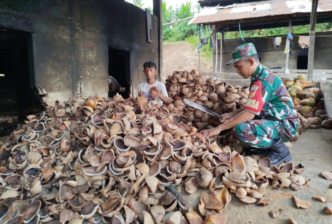 Aroma khas kelapa kering dan suasana gotong royong terasa akrab ditempat pengeringan kopra sederhana milik Aco Bunsal. Dengan senyum lebar, Aco mengungkapkan rasa terima kasihnya atas bantuan Babinsa yang dengan sukarela ikut turun tangan.