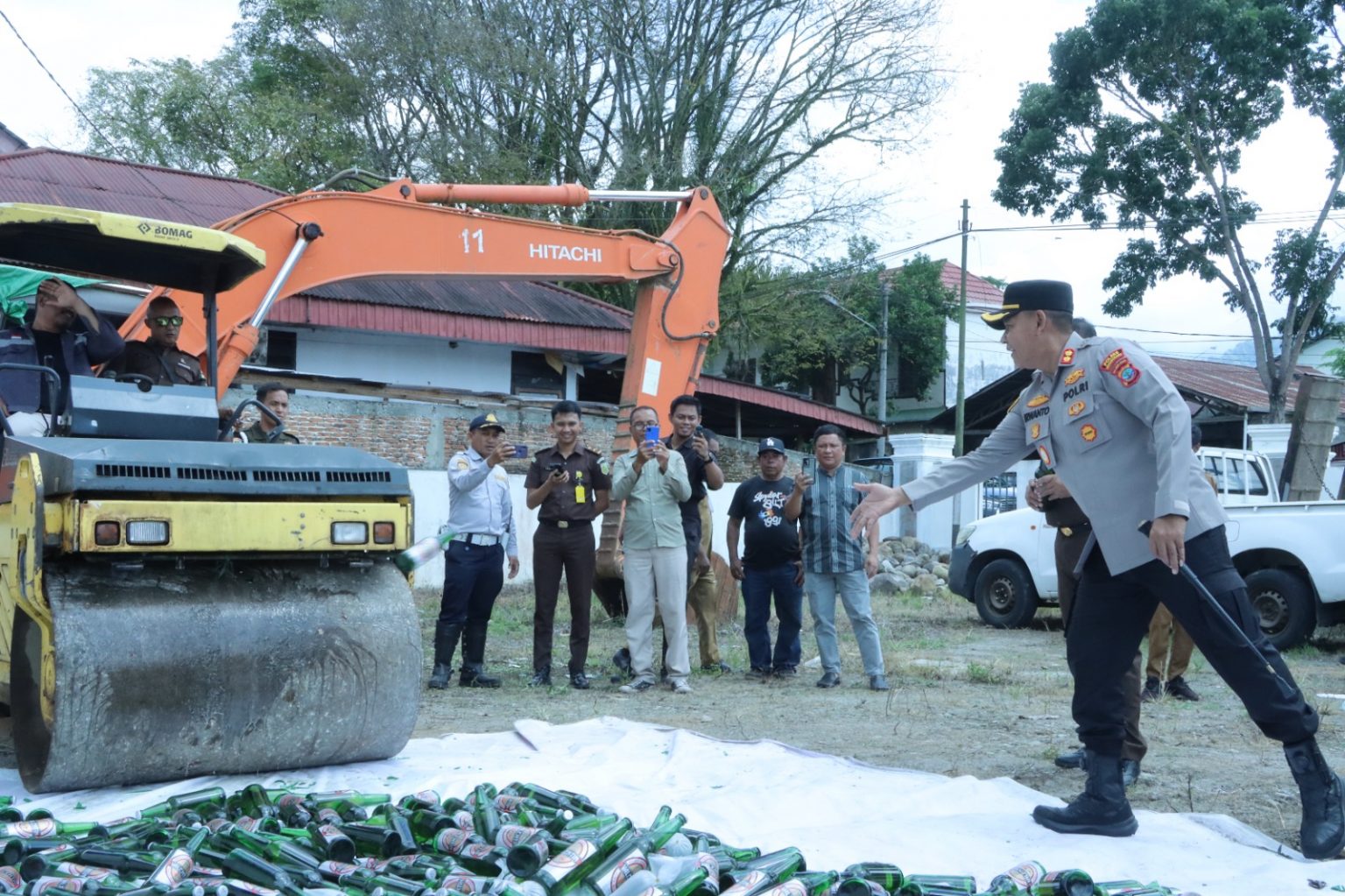 Adapun barang bukti yang dimusnahkan terdiri dari 15.745 botol minuman beralkohol ilegal, narkotika jenis sabu-sabu seberat 51,64 gram, obat-obatan terlarang, senjata tajam, serta berbagai barang bukti lainnya yang berkaitan dengan tindak pidana.