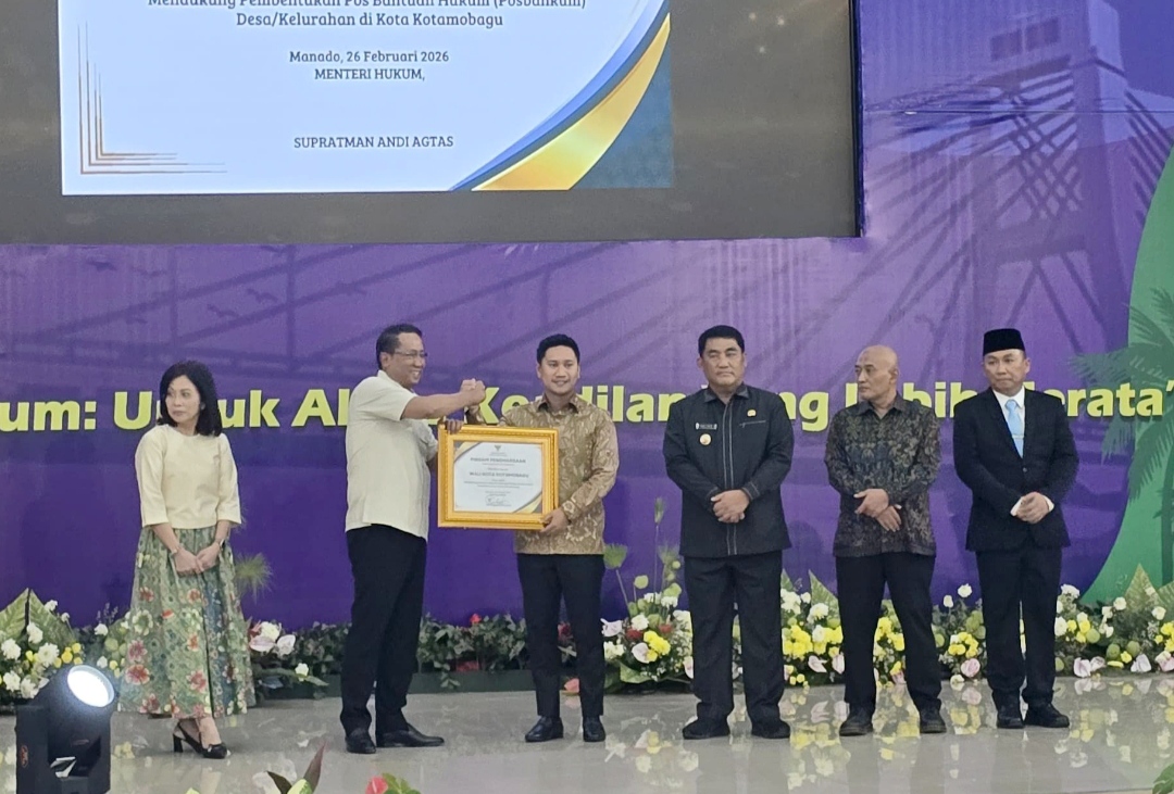 Pada kesempatan tersebut, Pemerintah Kota Kotamobagu menerima penghargaan dari Menteri Hukum Republik Indonesia, Supratman Dr. Andi Agtas, S.H., M.H., atas dukungan dan komitmen dalam pembentukan Pos Bantuan Hukum (Posbankum) di tingkat desa dan kelurahan.