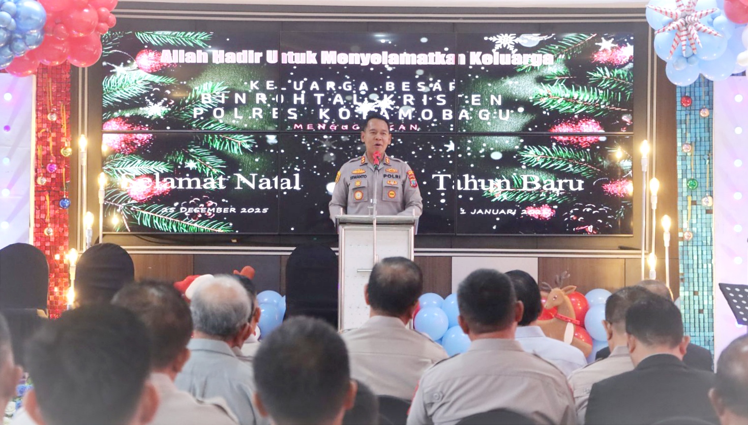 Hal ini disampaikan AKBP Irwanto, saat menghadiri Perayaan Natal Pohon Terang Tahun 2025 yang dilaksanakan Keluarga Besar Binrohtal Kristen Polres Kotamobagu, Kamis (18/12/2025).