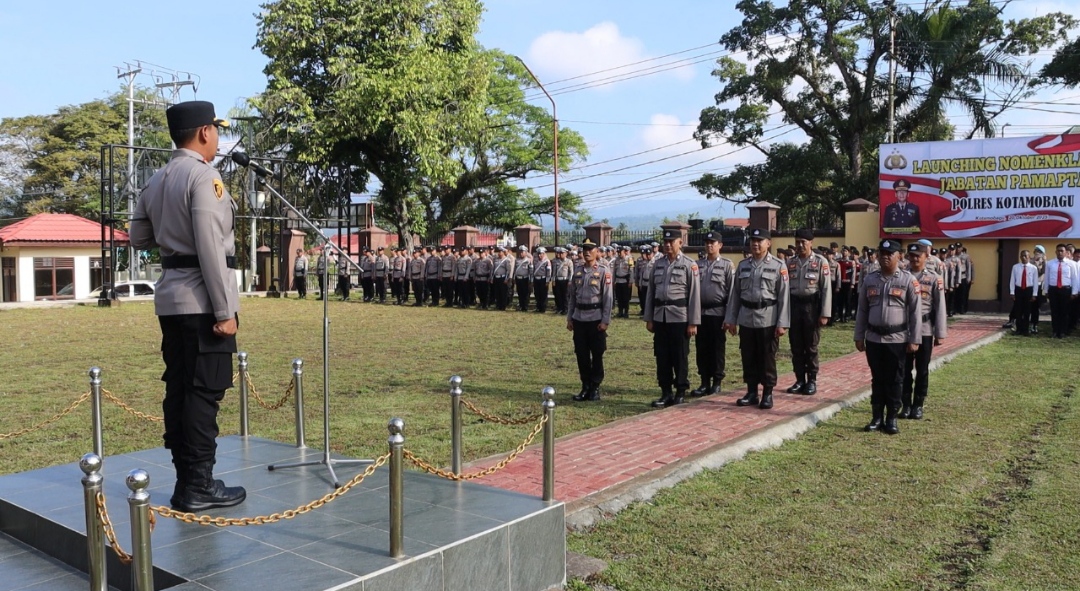 BOLMONGRAYA.CO, KOTAMOBAGU– Polres Kotamobagu melaksanakan Apel Pagi dirangkaikan dengan Launching Nomenklatur Jabatan Pamapta yang berlangsung di lapangan apel Mapolres Kotamobagu, Senin (20/10/2025).